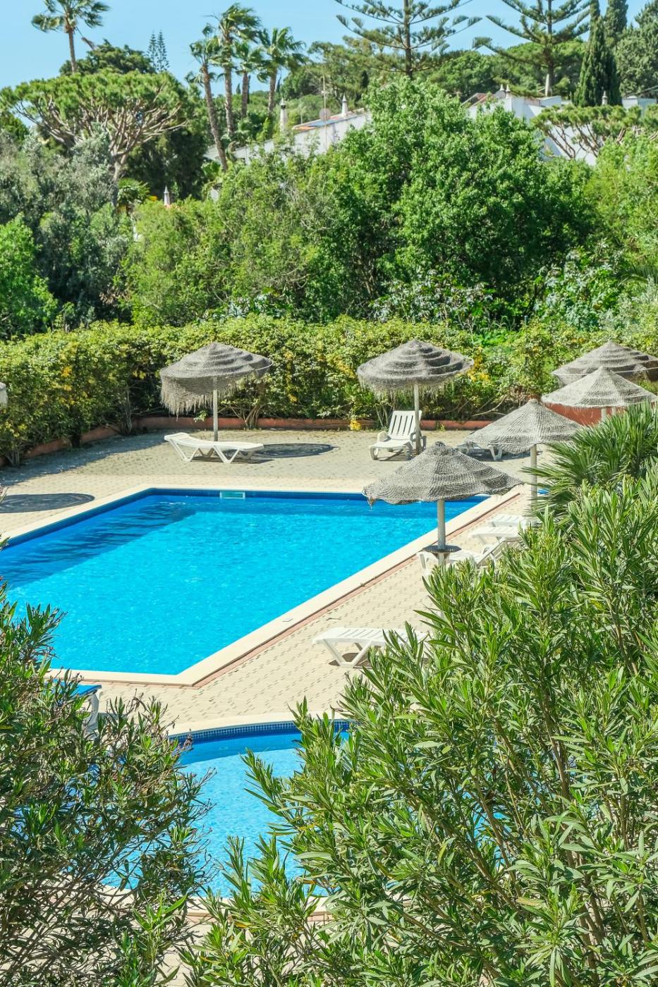 Casas do Ramalhete has 1 outdoor pool for adults and 1 smaller for children. The pool area is surrounded by a garden, featuring sunbathing areas, seating areas, barbecue and outdoor showers. The garden has sun loungers and chairs.